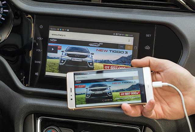 Со всеми «ю-тьюбами», «трипадвайзерами» и «вотсапами». Проще говоря все, что есть в вашем гаджете, может быть выведено на дисплей в машине. С одной стороны — очень удобно. Можно выбрать любимый навигатор или пользоваться любимым аудиоплеером. С другой стороны, количество намотанных на столбы и деревья Tiggo 3 из-за того, что водители засмотрелись на подборки курьезных аварий на YouTube, вряд ли можно будет списать на статистическую погрешность.