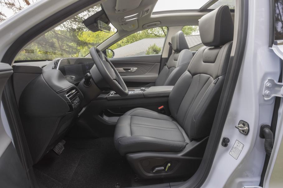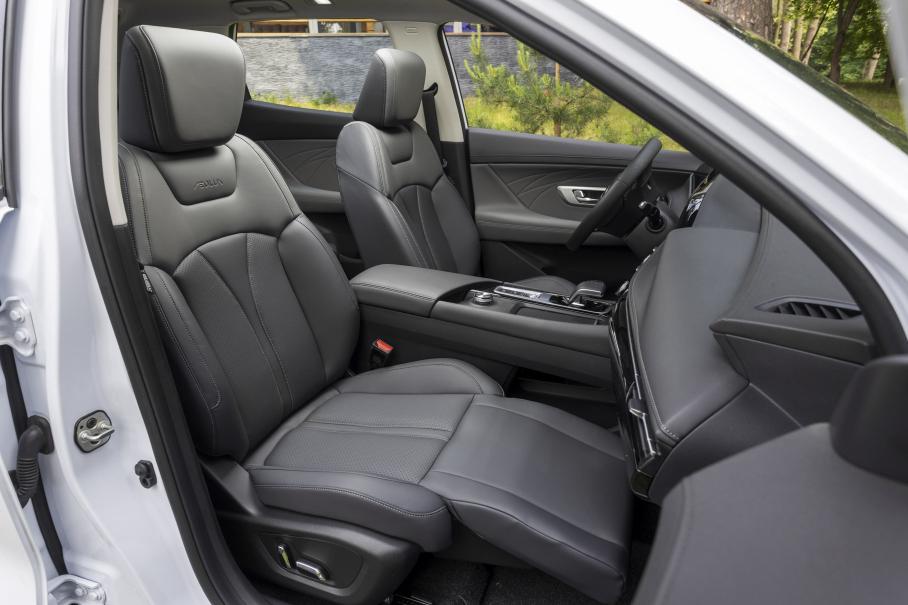 Салон крупного Huge сделан совсем иначе, более старомодно — без хитрых планшетов и с привычными кнопками стеклоподъёмников. И тоже имеет визуальное сходство с другой известной моделью — характерные сопряжения поверхностей передней панели напомнили мне Geely Tugella. В Huge больше аналоговых органов управления, чем в Mage — например, не надо лезть в мультимедийку для настройки зеркал. Селектор имеет традиционный формат джойстика, а не курка; телефон не нужно убирать в подполье парящей центральной консоли, а можно расположить на виду сверху; климат (также однозонный) регулируется большими шайбами в стиле хай-фай аппаратуры.