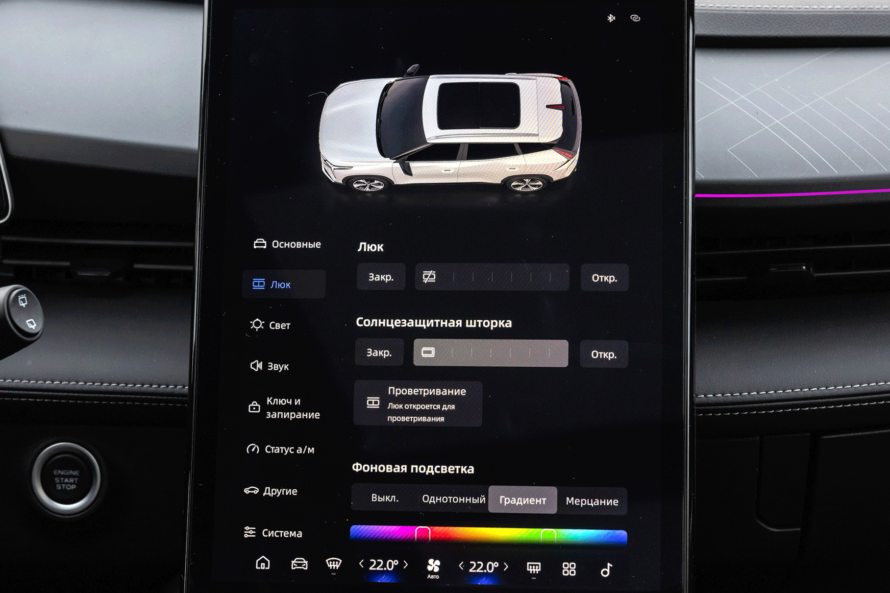 С бытовыми моментами всё немного сложнее. Салон интересен визуально, но неприветлив тактильно. Здесь нет ни традиционного уюта, ни шарма дорогого хайтека — вместо этого в основном бездумное подражание премиум-маркам. Например, многие элементарные функции — вроде управления панорамной крышей или даже обогрева заднего ряда — запрятаны в недра несоразмерно большого дисплея. И даже для выбора ездовых режимов пожалели физического переключателя — добро пожаловать в теслоподобный планшет.
