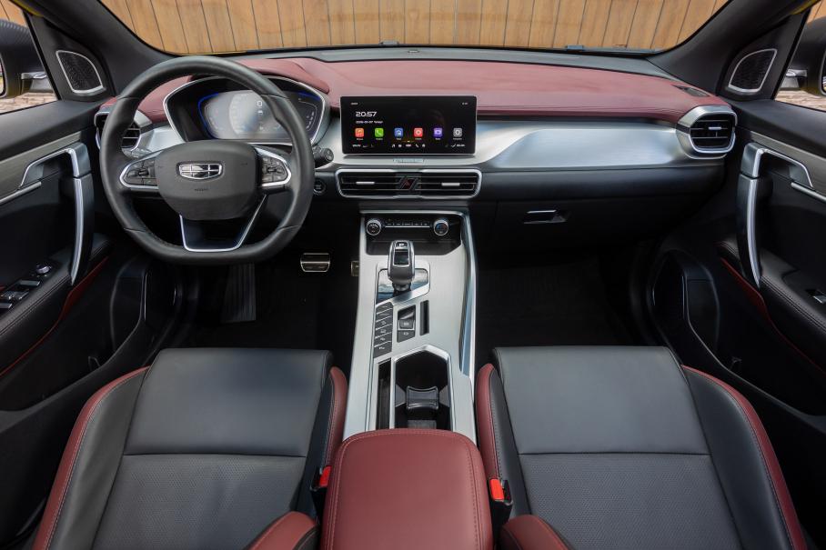 Интерьер Geely выглядит ярче за счёт тёмного потолка, двухцветной обивки и более экспрессивной пластики передней панели — боковые дефлекторы климата вообще напоминают о Lamborghini Urus! Также взгляд цепляется за приятно лежащий в ладонях скошенный руль (в Haval — ничем не примечательный круглый), металлические накладки на педали, управляющие стёклами клавиши-леденцы, и дерзкие ручки-скобы на дверных картах.