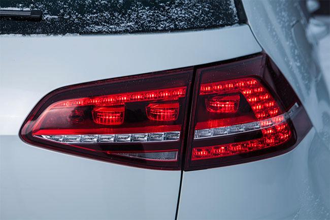 У обычного GTI эти полоски – красные (как и прострочка в салоне, и отделка знаменитой клеткой на сиденьях), у машины на «тяжелом топливе» – серые, а у гибрида – синие. Плюс к этому, у гибрида есть еще пара плюшек: полностью светодиодная оптика, большие С-образные LED-светильники дневного света, синие суппорты тормозов и необычные «аэродинамические» 18-дюймовые диски. Красотища!