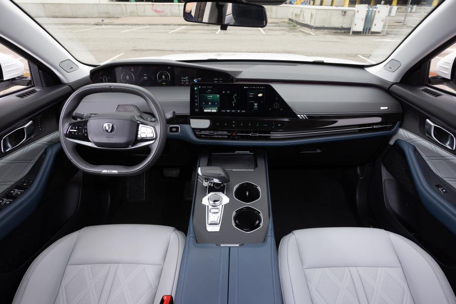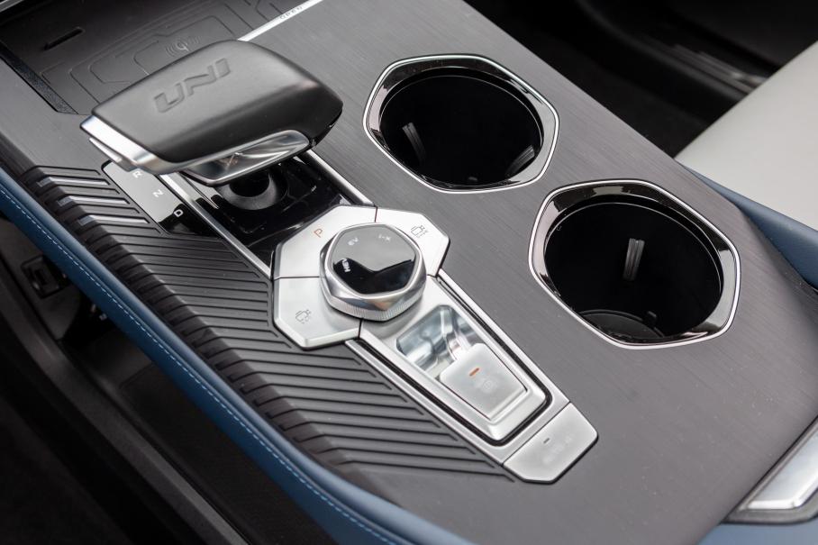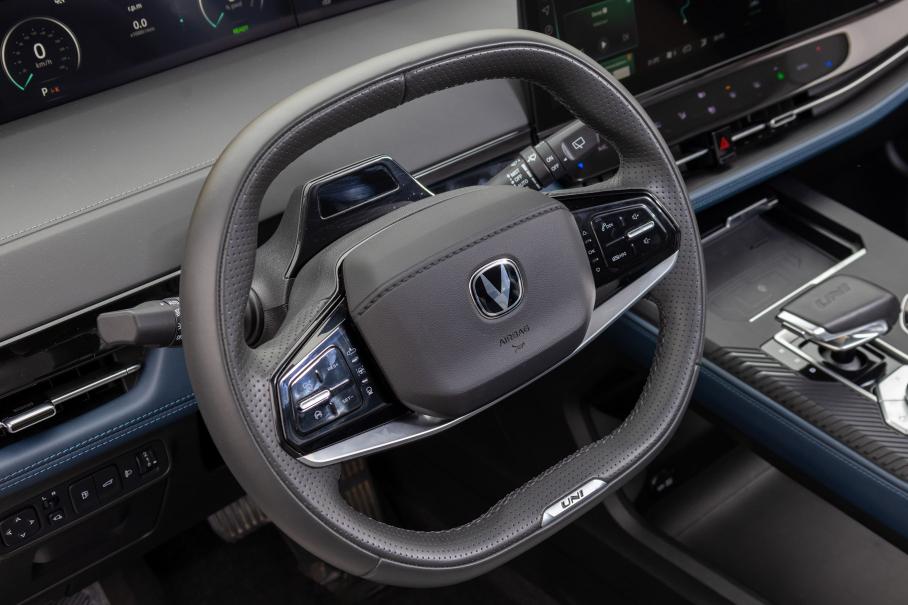 В интерьере тоже отличий не много. Самое главное — это чуть более роскошная отделка. Салон выполнен в бело-синей гамме вместо стандартного скучного чёрного, как у исключительно бензинового Uni-K, дверные карты обшиты мягкой кожей с ромбовидной прострочкой, а на некоторых элементах используется замша. Модель и раньше не разочаровывала материалами отделки, но гибридный вариант ощущается ещё богаче и приятнее. А футуризм с россыпью экранов на передней панели самой технологичной модификации кажется как никогда к месту.