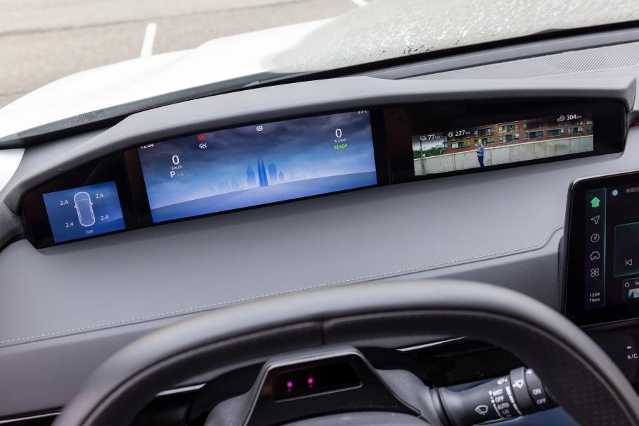 Четыре дисплея перед водителем поначалу обескураживают. Но привыкаешь быстро: крайний левый сообщает о давлении в шинах, на приборке — скорость, данные борткомпьютера и индикация работы ассистентов, а на правый может выводиться изображение с камеры заднего вида — порой очень удобная штука, дублирующая обычное аналоговое салонное зеркало. В общем, всё то же, что и у обычного Uni-K с той лишь разницей, что на экранах ещё можно увидеть степень заряда батареи силовой установки, а также общий запас хода и километраж возможного пробега на электротяге.