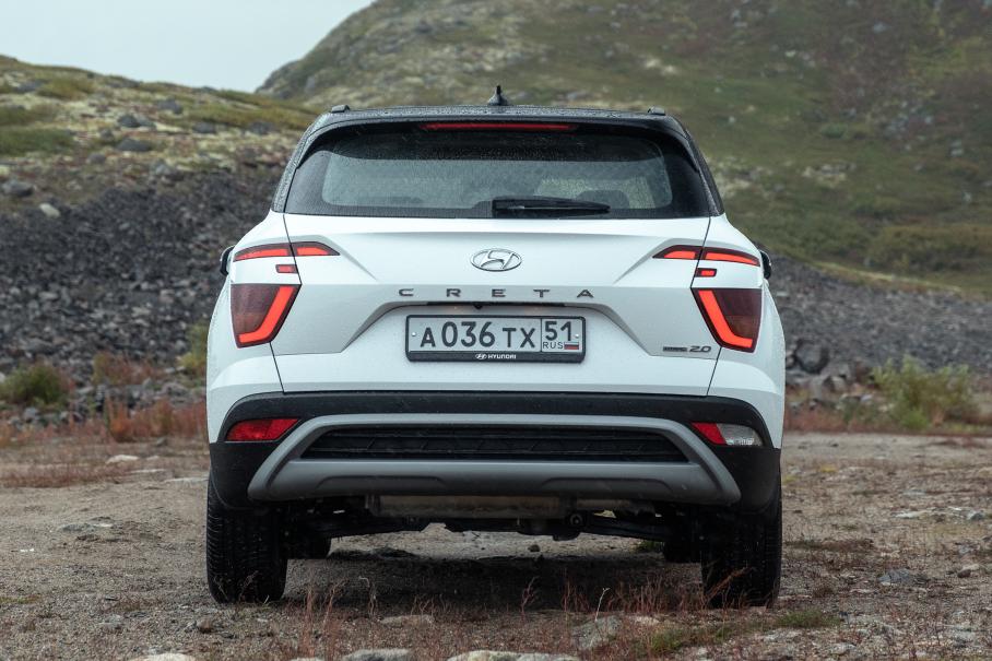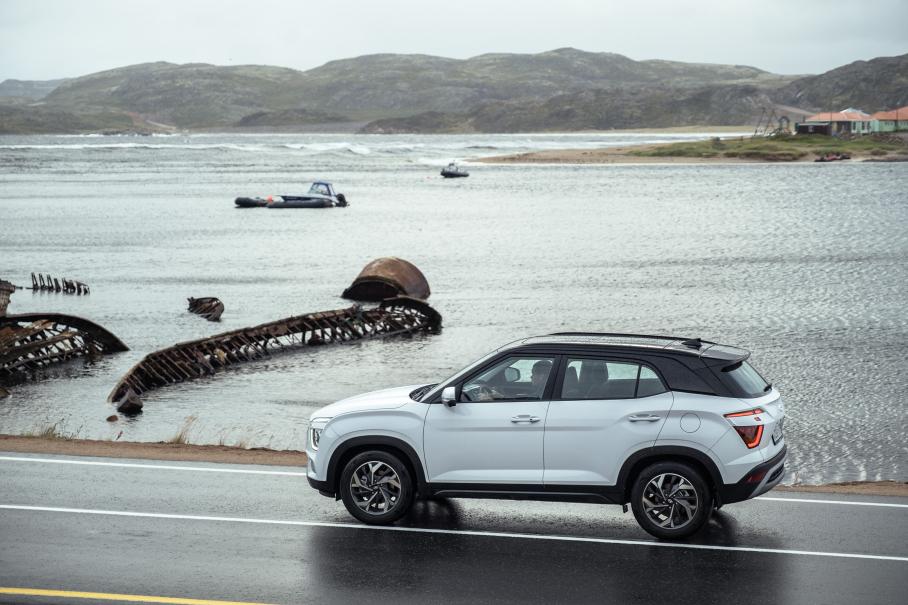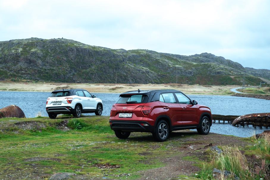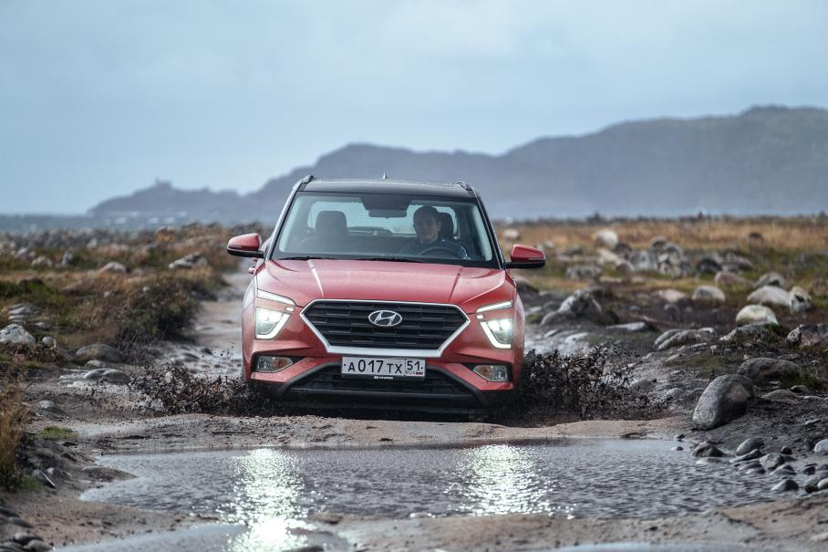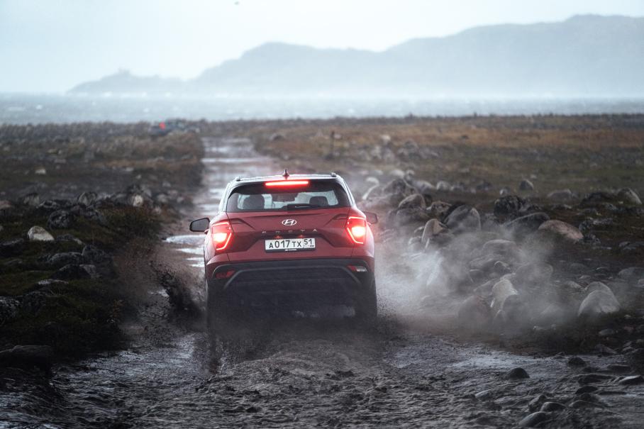 Проходимость Креты достаточна для кроссовера — 190 мм под днищем, и умеренные свесы позволяют увидеть больше чудес природы, чем за рулём легковушки. Проехать к суровому берегу Баренцева моря на том же Солярисе не получится — дорога усеяна валунами и глубокими лужами. Но геометрия даже переднеприводной Креты уже позволяет пройти этот маршрут и насладиться солёными ледяными брызгами на каменном берегу.
