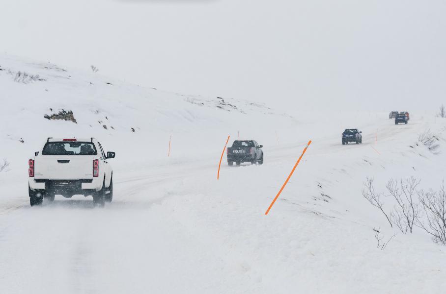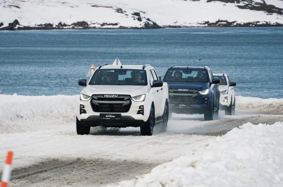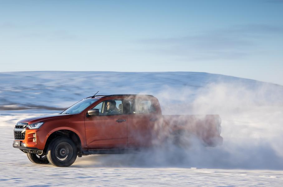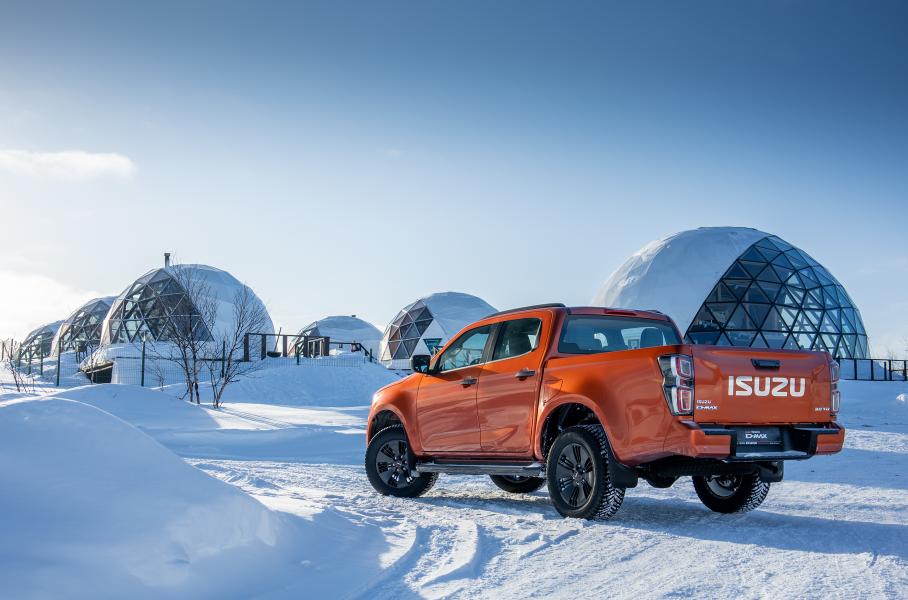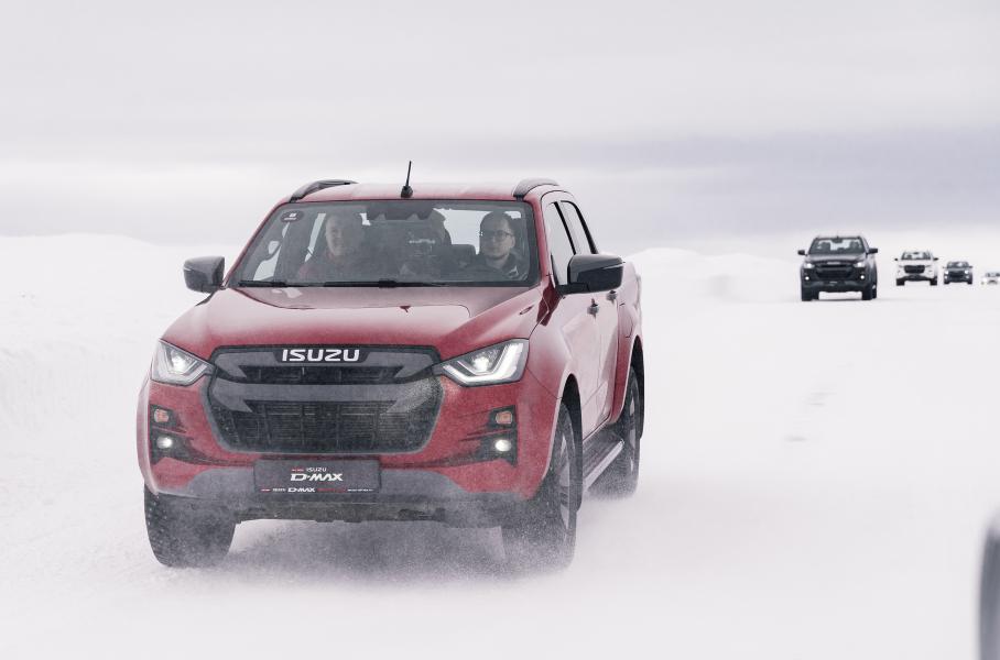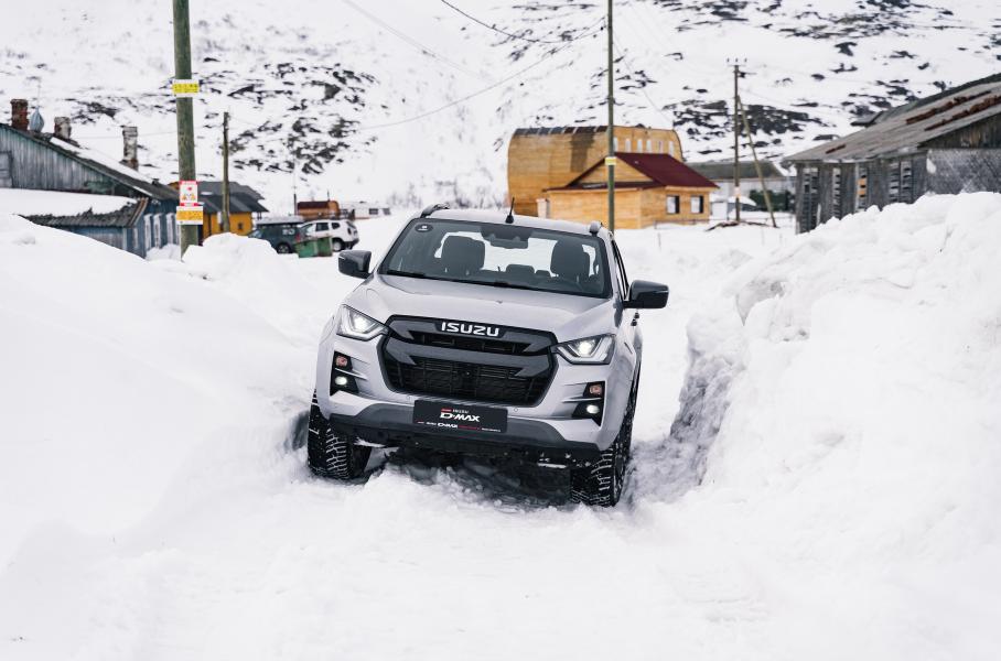 Празднично смотрятся среди безбрежных волн снега пикапы в новых рыжих и синих расцветках! Правда, сходу отличить их от пикапа прошлого поколения, что шёл с нами в качестве технички, не получится. На первый взгляд, всё это выглядит как не слишком глубокий рестайлинг: Isuzu сохранил характерную физиономию с насупленными фарами и клыкастой радиаторной решеткой, а получил лишь новый передний бампер с увеличенным воздухозаборником и оптику с более современной «начинкой».