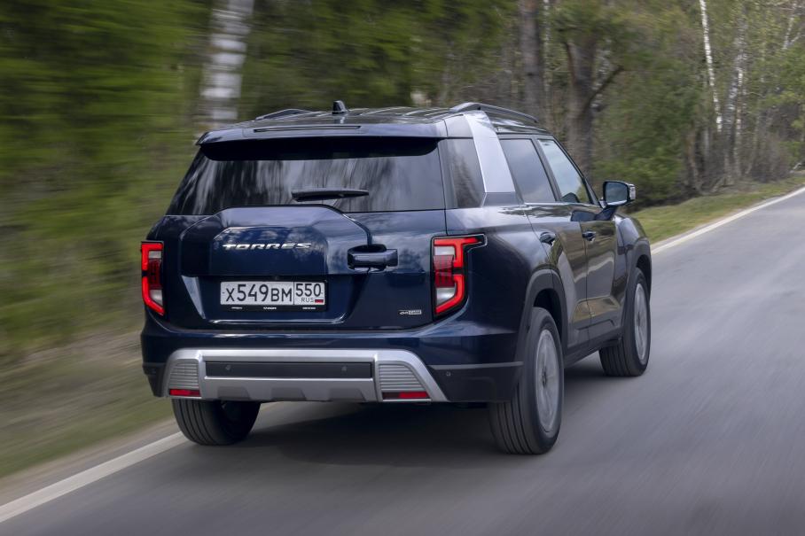 В дизайне Torres ещё много интересных решений. Например, задняя дверь подъёмная, хотя выглядит распашной — за счёт фальшкофра запаски (как в Haval H3) и расположенной справа от него ручки. Это решение должно придавать кроссоверу внедорожной брутальности. С той же целью тут развитые накладки по нижнему периметру, бутафорские петли на капоте и яркая крышка отверстия для проушины. Но из реальных внедорожных способностей — только увеличенный до невыдающихся 195 мм (в сравнении со 182 мм у Korando) дорожный просвет.