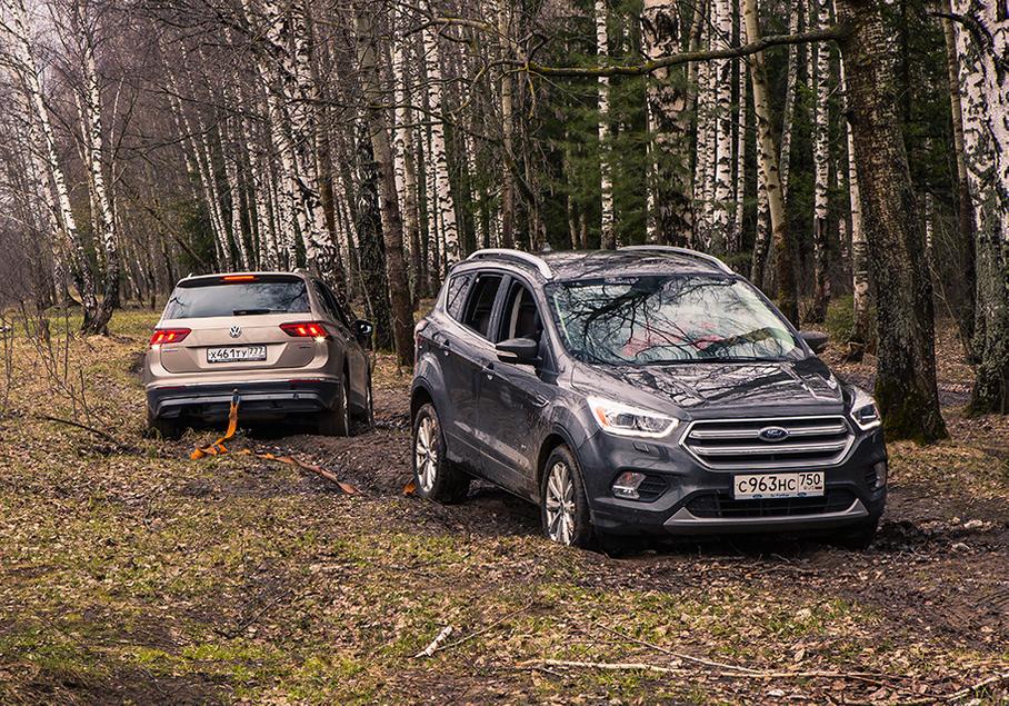 К способностям «Форда» претензий за полдня бездорожья не возникло. Угол въезда у него больше, что позволило беспроблемно падать в глубокие ямы и выбираться из них обратно. Кроме того, по пути он спас не только «Тигуан», но и китайское нечто, прочно засевшее в жидкой грязи. Буксировочным проушинам «Форда» VW может только позавидовать — у «Куги» их целых две!