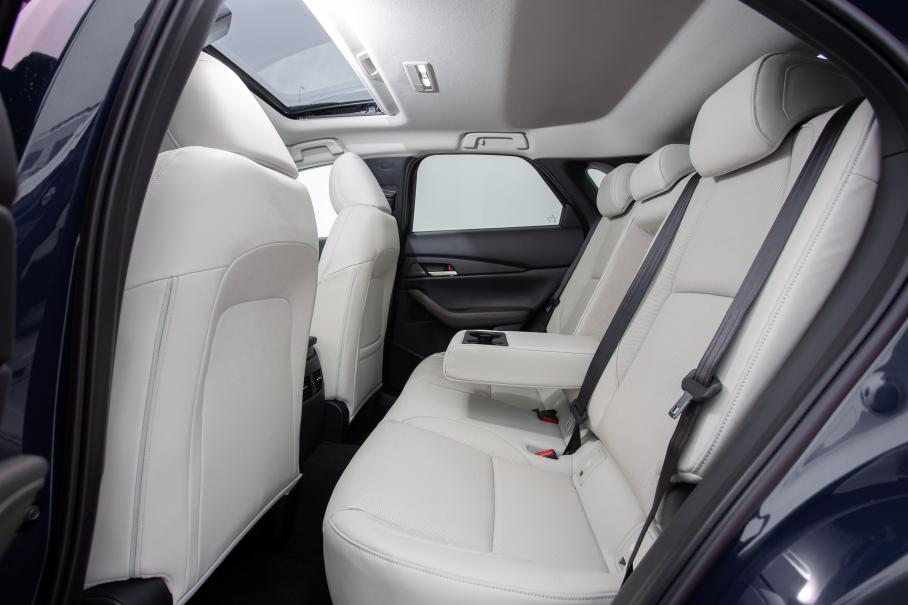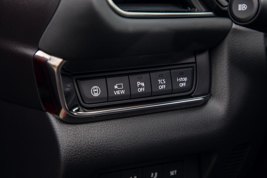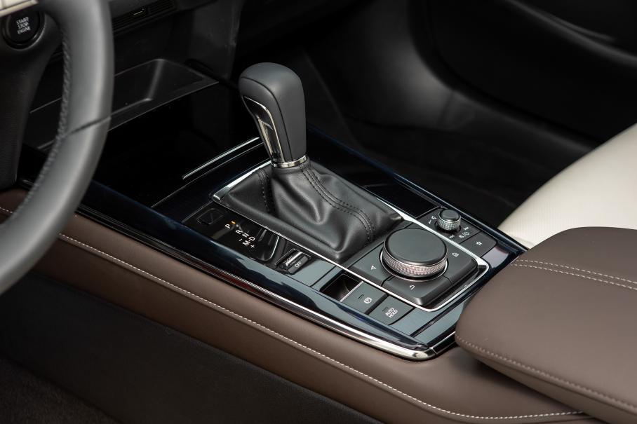 Что однозначно удалось Мазде — это интерьер. Эстетичный, удобный и серьёзный во всех смыслах салон. Кожа и пластик по качеству не хуже (а в отдельных случаях даже лучше), чем у признанных премиум-марок. Лаконичность форм и опоясывающая архитектура передней панели создают уют, а отсутствие вычурных элементов и дисплеи с тёмной графикой умиротворяют. Высокое качество демонстрирует даже работа клавиш и переключателей — на слух и тактильно. И не удивительно, что тут нет ставшей стандартом атмосферной подсветки — подобное украшательство в этом самодостаточном пространстве будет лишним.