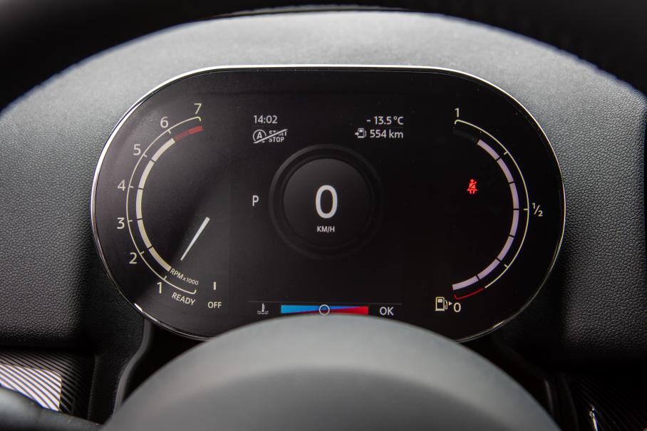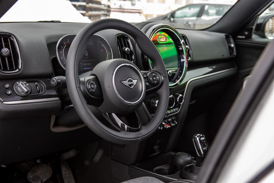 В салоне Кантримэна больше всего понравилась обивка рогожкой в модном сейчас эко-стиле. Практичная и приятная ткань. А вот матовое стекло приборки, закреплённой на рулевой колонке и лишённой козырька, делает графику слегка размытой и малоконтрастной. Ещё более бестолковым этот дисплей становится из-за невозможности видоизменять интерфейс.