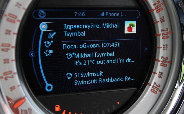 Не впечатлила и продвинутая мультимедийная система, установленная на тестовый MINI Countryman. С айфоном она так до конца и не подружилась – при попытке использовать смартфон для передачи данных электроника потребовала обратиться к дилеру для активации соответствующей функции. А специальное приложение для iOS, с помощью которого водитель может общаться со своим автомобилем – узнавать запас топлива или следить за статистикой поездок – оказалось, по большому счету, бесполезной игрушкой. Во-первых, работает оно только при подключении телефона шнуром, а во-вторых, возможность отправлять шаблонные сообщения в «Твиттер» (по-английски) с содержанием вроде «На улице +26 тепла, и я катаюсь на своем «Мини», или «Я еду на Красную площадь» – не самый увлекательный способ времяпрепровождения, даже в самой глухой пробке.