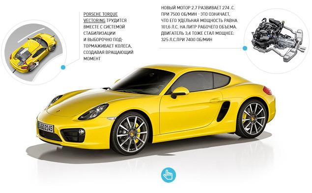 Моторы – те же, что и у Boxster, только чуть мощнее. Базовый 2,7-литровый «оппозитник» развивает 275 лошадиных сил (против 265 лошадиных сил у «Бокстера»), а 3,4-литровый Cayman S может похвастать 325 силами (на те же 10 сил больше, чем у родстера). Шестиступенчатая «механика» идет в базе, но за доплату можно заказать классный семиступенчатый «робот» PDK. В списке опций у «Каймана» вообще много «вкусного». Есть и адаптивная подвеска PASM с двумя вариантами жесткости, и система контроля вектора тяги (PVT), которая доступна только в комплекте с задним механическим «самоблоком», и которая помогает заправить машину в поворот за счет избирательного подтормаживания колес. Причем работает она даже при полностью выключенной системе стабилизации.