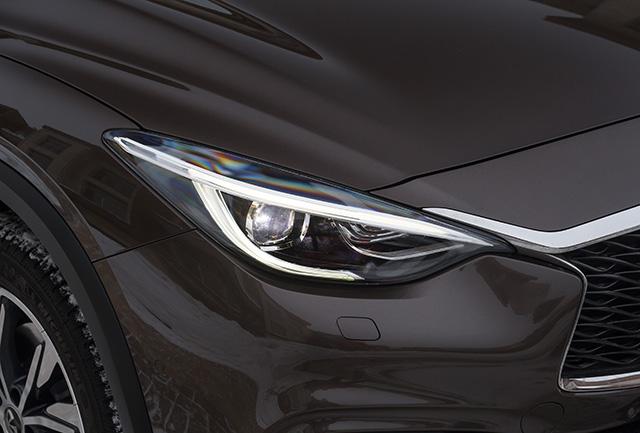 Ставлю 99 против одного, что если вы в жизни не видели ни одного «Мерседеса», то ничего в Infiniti QX30 у вас не вызовет вопросов. Скучным этот автомобиль назовет только человек в состоянии клинической депрессии. У «Финика» высокий поджарый силуэт, сложные линии выштамповок на кузове, 20-сантиметровый клиренс, раздутые арки с пластиковыми накладками, большая решетка радиатора в хроме и светодиоды в фарах.