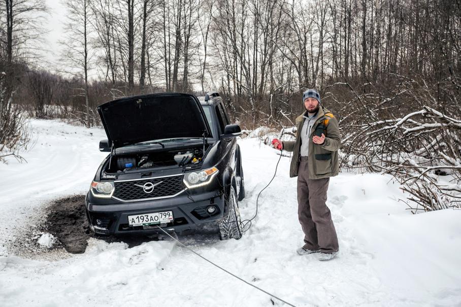 Пробуем еще раз УАЗом, но аккуратненько, по кромке колеи. Первое проблемное место осталось позади, но на дорожных шинах «Патриот» опять стаскивает, и он снова пробивает лед, повиснув на бедняге-редукторе. Снова трос, снова «Джип» и пара отчаянных рывков, которые вынимают УАЗ из плена.