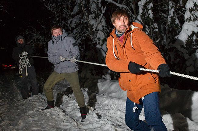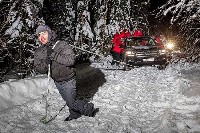 Автомобиль, которому требуется помощь, в полутора километрах позади, но сдать назад по такому снегу — нереально. Поэтому мы берем с собой инструменты, домкрат и мужество, и очень-очень быстро – холодно! – топаем через ночную тайгу. Главное, не забывать во всем искать положительные моменты — сколько звезд над головой! Такого неба в Москве не увидишь.