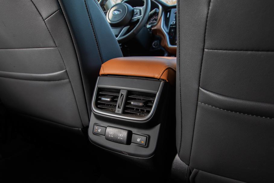 Передняя панель вся зашита в мягкую двухцветную «Наппу» с контрастной прострочкой; по центру большой дисплей в стиле Tesla, на который выводится высококачественная картинка с круговых камер; над бардачком аккуратная уютная полочка; дорого звучит акустика Harman Kardon с сабвуфером; есть беспроводная зарядка и даже матричные фары высокого разрешения. Это точно Subaru, чьи автомобили десятилетиями были по-спартански суровы внутри, а список опций к ним был едва ли длиннее предсказания из печеньки?