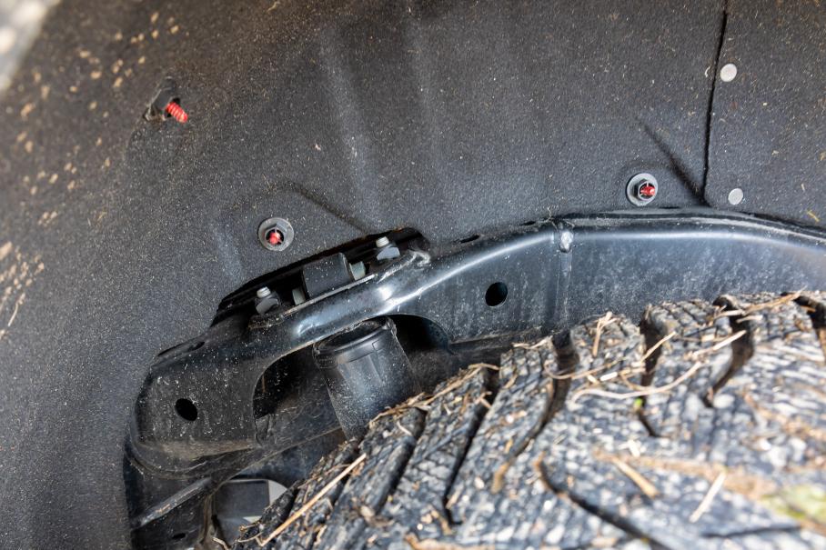 Днище практически ровное, и даже самая нижняя точка шасси — «яблоко» заднего моста — почти не выдаётся из этой плоскости. Поэтому рассчитывать глубину колеи и запас пространства легко, что и будет доказано во время теста: если автомобилю не хватает клиренса, это становится ясно уже на этапе штурма колеи передней осью. Так проще вовремя оценить ситуацию и сдать назад для поиска иной траектории вместо того, чтобы идти на штурм и в итоге глубоко и прочно зацепиться корпусом заднего редуктора, словно якорем. Но если застревание произошло, то прицепить трос сзади легко, а вот нырять к проушинам глубоко под передний бампер оказывается затруднительно.