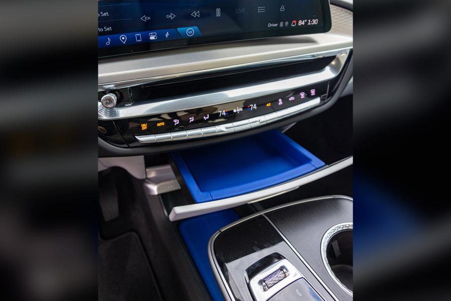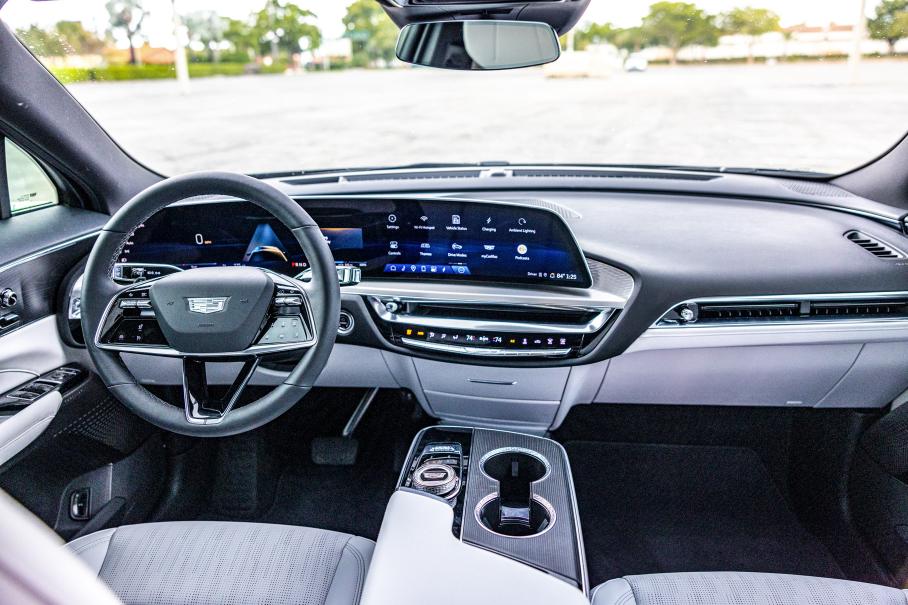 В интерьере дизайнеры попытались создать связь с историческим наследием марки. Обилие хрома в отделке, миниатюрные «джойстики» управления дефлекторами — привет из шестидесятых. За наши дни отвечает единый дисплей на передней панели, который сочетает медиасистему, виртуальную приборку и другие функции. Он имеет вогнутую поверхность, диагональ 33 дюйма. Чем-то он напоминает экран в Escalade, но здесь он сплошной, без явных границ склейки и отличается от ставших слишком похожими друг на друга дисплеев других автопроизводителей. Главное его преимущество — деление на зоны.