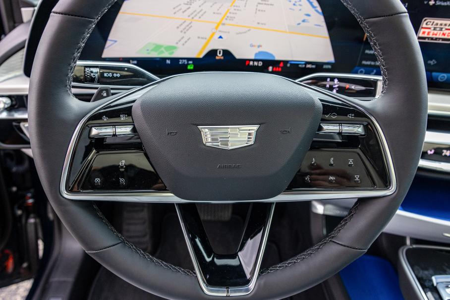Что до обратной связи, то ее недостаточно. Желание изолировать водителя от любого стресса приводит к тому, что на руле не хватает информации в предельных режимах. При том, что мощности и уж тем более момента на колеса приходит немало, хотелось бы получить чуть больше реактивного усилия. Хотя мотивы инженеров понятны: большую часть времени Lyriq будет ехать на 20–30% от своих возможностей.