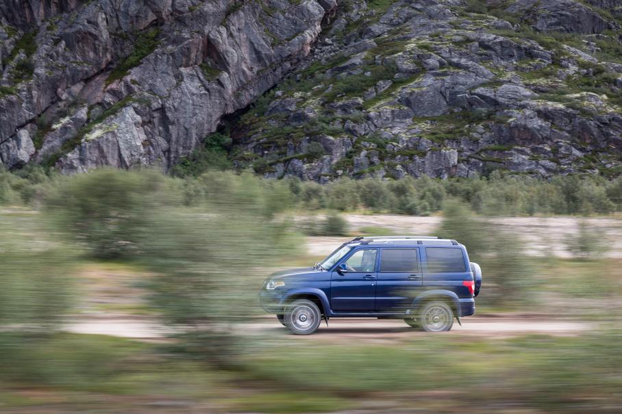 Как говорили в один голос Ницше, Коко Шанель и актер Джейсон Стэтем, красота — она внутри. В УАЗе с этой цитатой знакомы, поэтому внешне «Патриот» не изменился совсем. Хотя нет, появился свежий дизайн колесных дисков для богатых комплектаций и новый синий цвет. Я бы предпочел для выбранного маршрута черную стальую штамповку, но этот крик души в тундре слышат лишь кусты брусники. Зато литые колеса обувают в резину Continental CrossContact — и она точно лучше китайского «ноунейма».