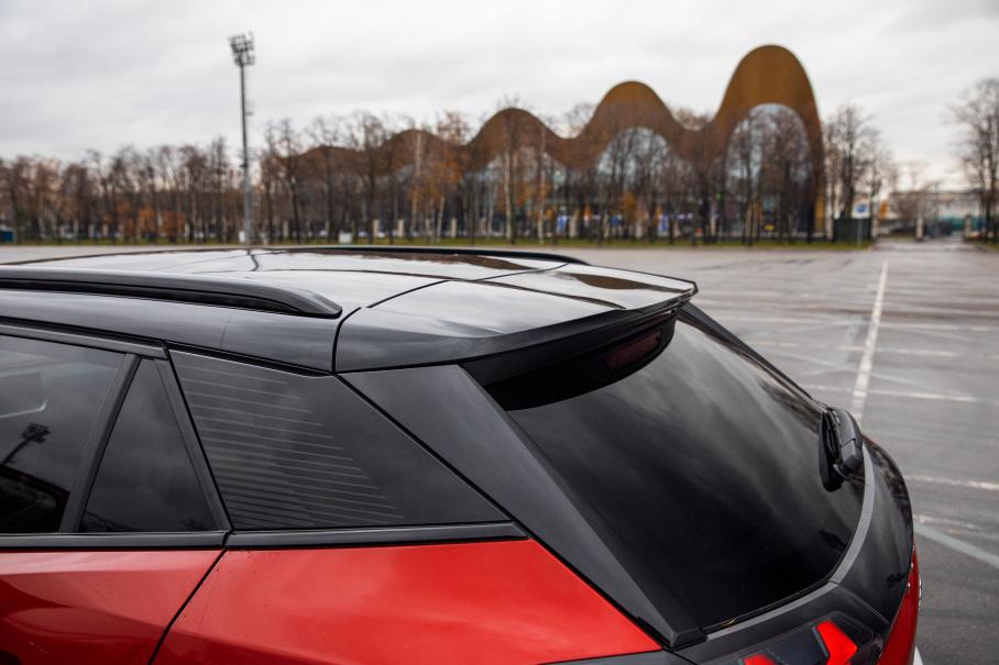Дизайн словно придумала нейросеть, которой скормили фотографии всех Фольксвагенов последних десяти лет. И особенно это заметно рядом с Peugeot, к которому с какой стороны ни подойди — залипнешь, рассматривая детали. Преломления и отражения в сложной пластике боковин, саблезубый светодиодный оскал спереди и рубиновые огни под дымчатыми обтекателями оптики сзади, вздёрнутая к хвосту подоконная линия и двухцветный окрас — загляденье.