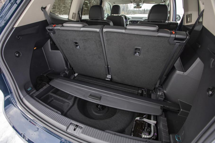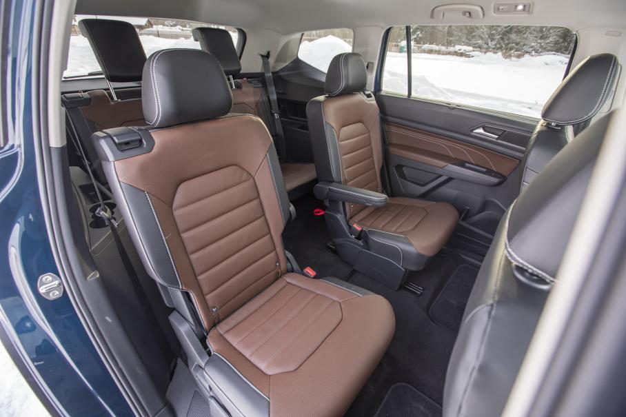 А ещё в Фольксвагене значительно больше места для пассажиров и грамотнее организовано пространство для них. Третий ряд полноценный, с нормальной посадкой и достаточным простором даже для взрослых. При этом не обязательно притеснять пассажиров среднего ряда сдвиганием их кресел до упора вперёд — простора хватит для всех. Опциональное решение с капитанскими креслами делает из кроссовера почти минивэн — получается шесть удобных мест с дополнительной возможностью перемещения по салону.