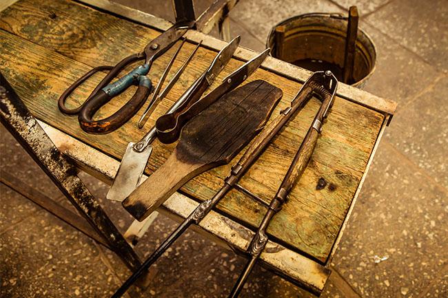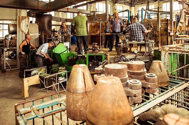 Прохаживающиеся вокруг в шлепанцах мастера пьют никогда не остывающий чай, набирают в полую трубку раскаленную, как шаровая молния, стеклянную массу, раздувают ее в пузырь и с помощью шаблонов и металлических форм придают вид будущего бокала.