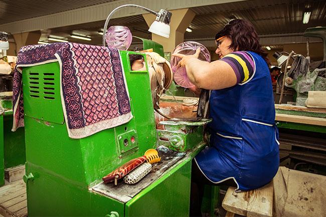 Дав бокалу остыть и снять внутреннее напряжение в более холодной печи, где можно запросто выпекать пиццу или жаркое, на хрусталь фломастером наносят рисунок, а потом вручную вырезают его на станке. Так что каждый бокал хранит следы прикосновения человеческих рук и чуть-чуть отличается от остальных.