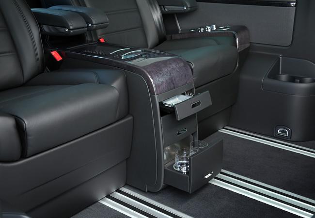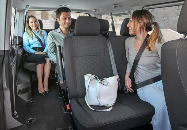 Салон Multivan в комплектации Business. Клавиши электрорегулировок на боковых подлокотниках блестят, как в ванной, а на дверной стойке есть держатель для планшета